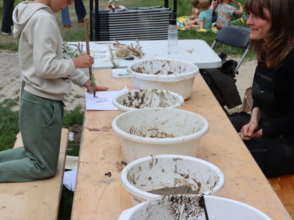 Bij Natuureducatie Dril: Tekenen met modder / natuurlijk materiaal- af en toe vies worden is namelijk gezond..